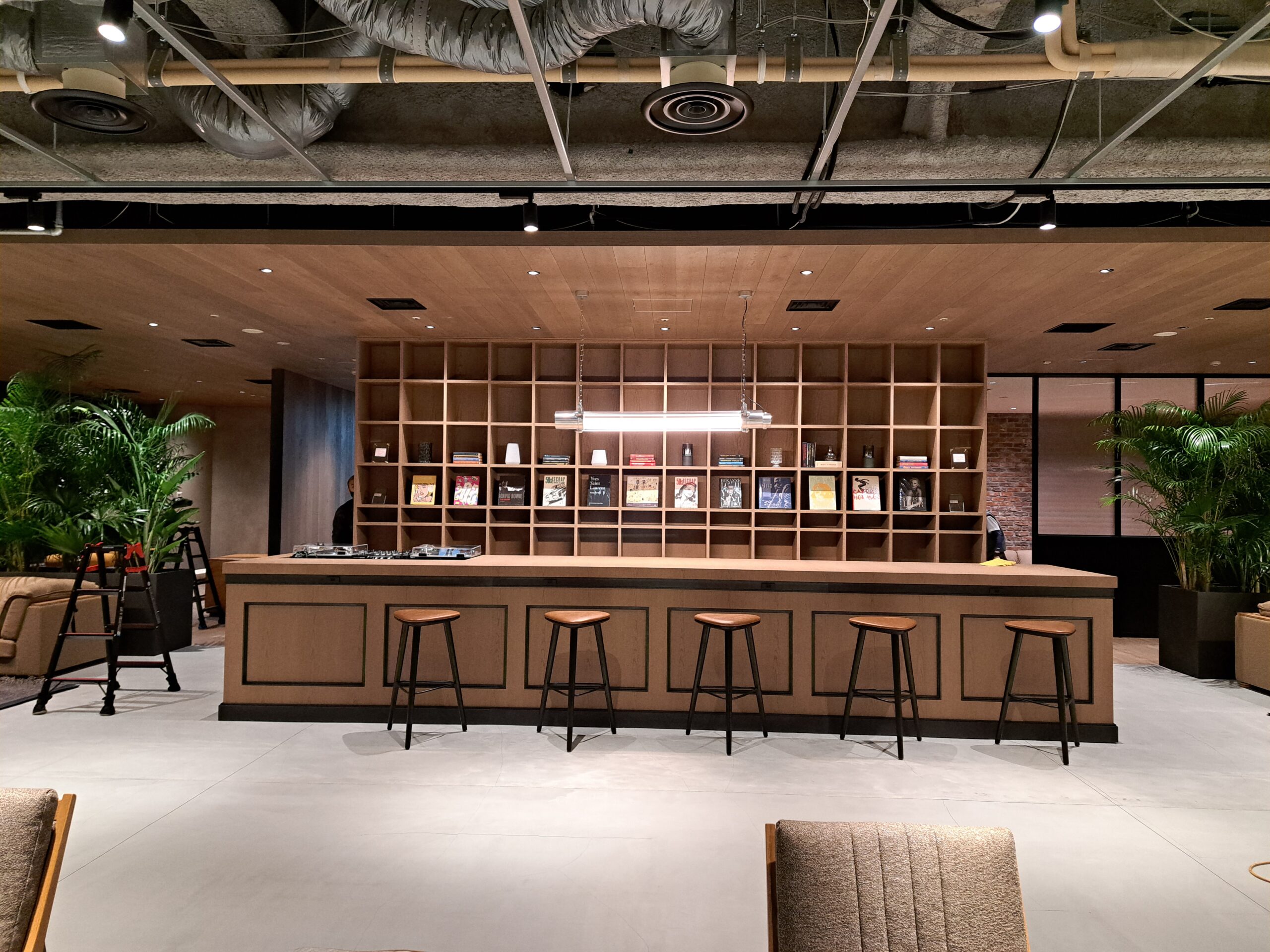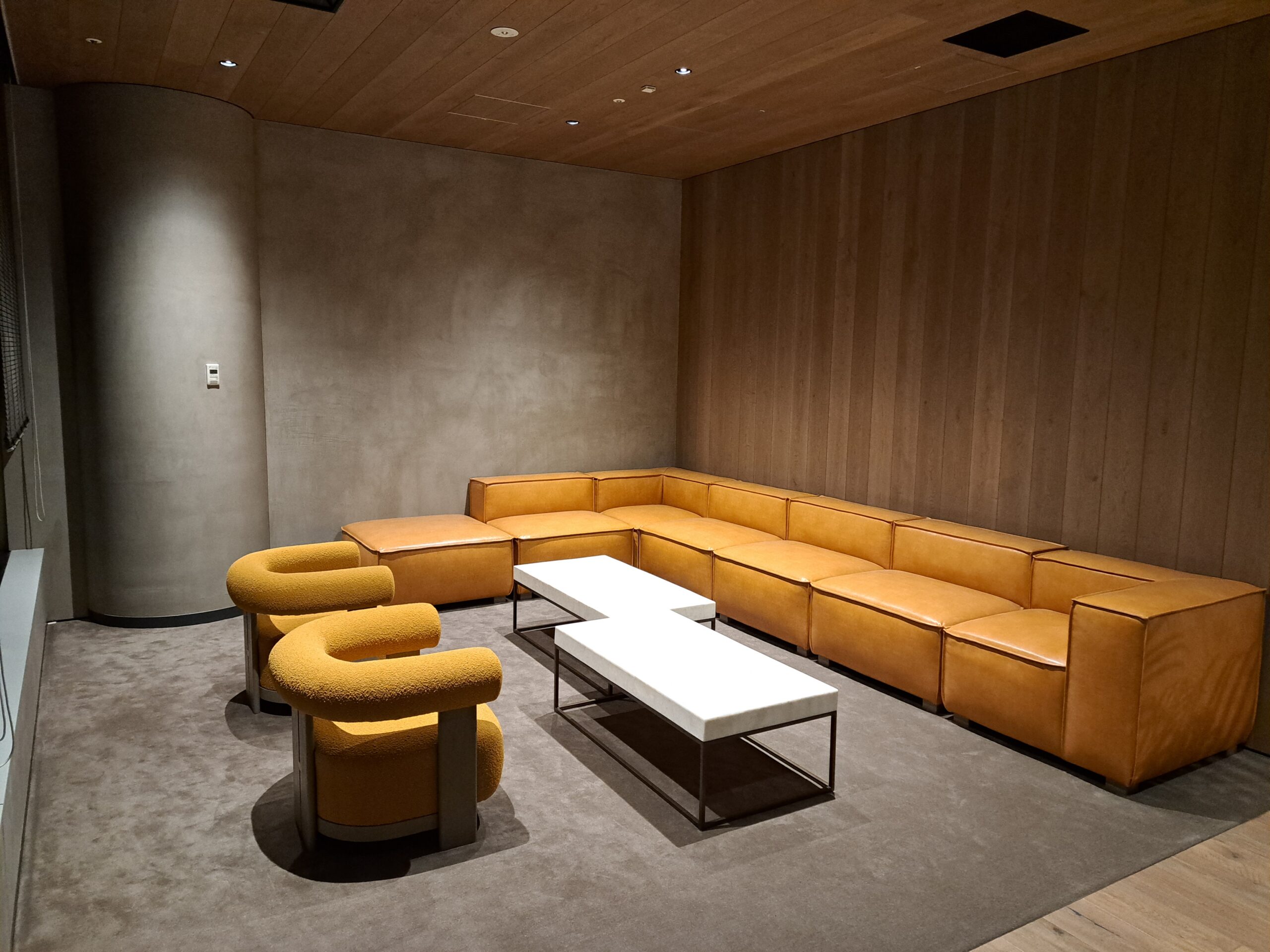 今までのリフレッシュエリアとは一線を置き長い時間いても飽きないラウンジ、木・モルタル・スケルトン天井による異空間としました。